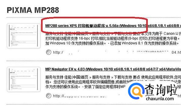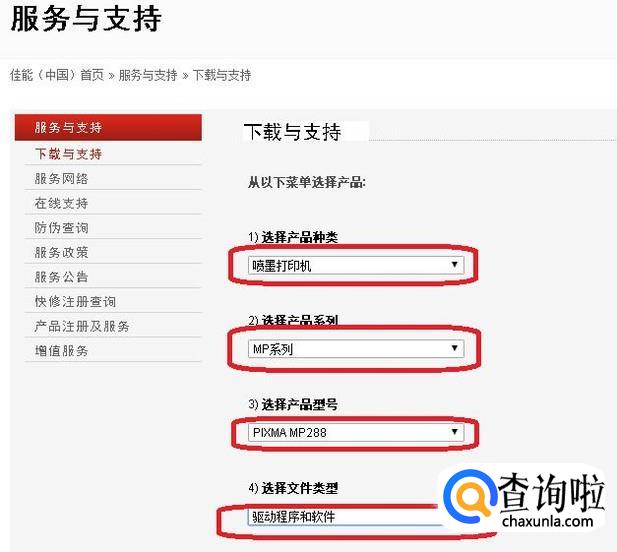 进入网站后,如图所示,我们需要选择产品。依次选择“喷墨打印机”、“MP系列”、“PIXMA MP288”、“驱动程序和软件”。