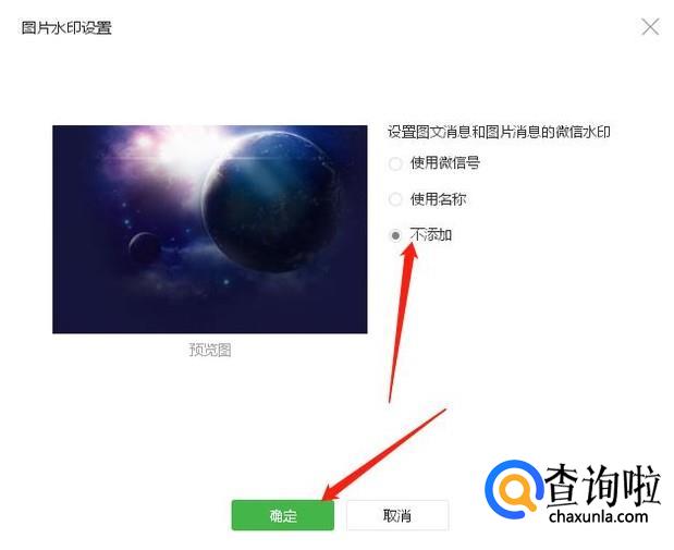 进入“图片水印设置”后,点击“不添加”,再点击“确认”,以后发微信公众号就看不到图片上的水印了。