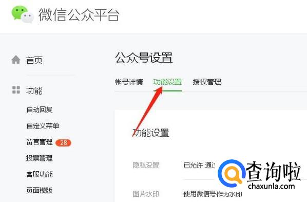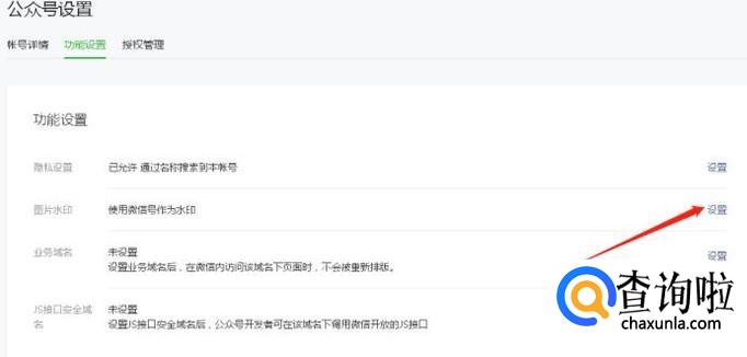 进入“公众号设置”界面后,点击“功能设置”,在“功能设置”一栏中找到“图片水印”,点击“图片水印”后面的“设置”。