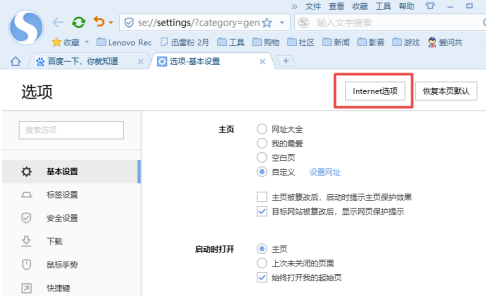 4、之后点击Internet选项;