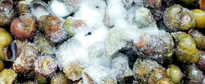 3、就这样把田螺泡在盐水里泡一两天。由于盐份的刺激,田螺会拼命的吸水、吐水,吐出里面的泥沙。