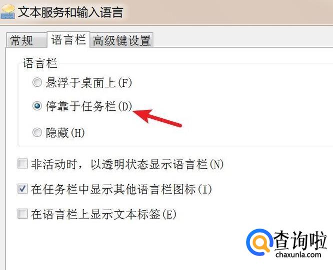 打开语言窗口,点击中间项‘语言栏’,并在这里勾选上‘停靠于任务栏’,这样就可以了。