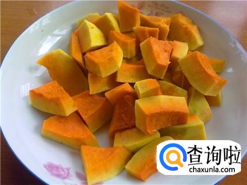 南瓜清洗干净之后,把南瓜的皮以及南瓜瓤子去掉,再次清洗干净,然后切成小块,或者切片也行,随便你切。