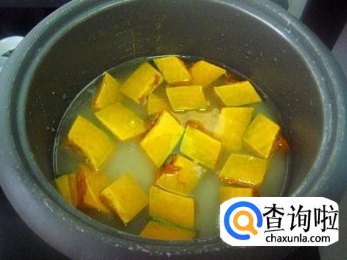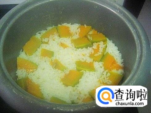 这时候把南瓜块全部铺在大米上面,这样电饭煲开始煮饭的时候,南瓜的味道就会完全融入到大米饭中了。