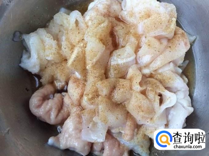 将洗干净的鱼肠切成小段,加入胡椒粉、油和盐进行腌制,腌制半个小时。