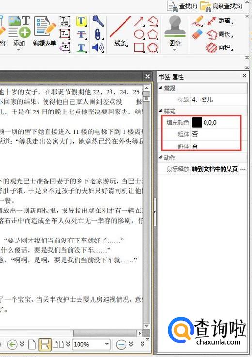 比如我们这里选择修改书签的属性,点击选项中的属性,这时候界面的右侧会弹出一个书签属性栏,在这里我们可以对书签的填充颜色、粗细、斜体等属性进行设置。