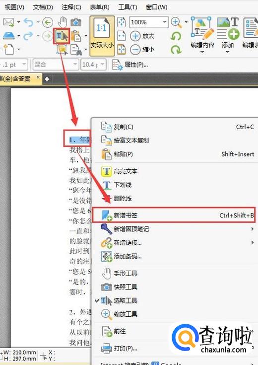 将pdf文件打开后,我们点击界面上方的选取工具,然后在下方选取需要作为书签的文字,用鼠标右键点击选取的文字,再单击选项中的新增书签。