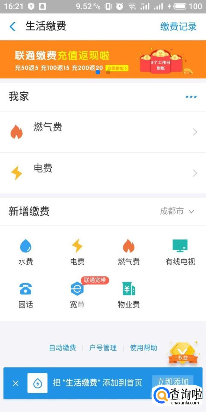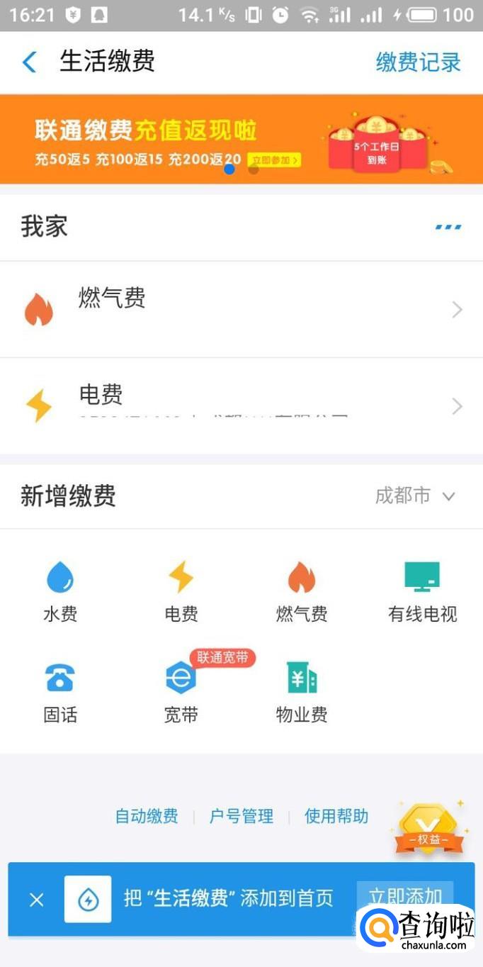 进入生活缴费界面,在界面中可以点击添加已经进入的缴费,也可在下边新增。