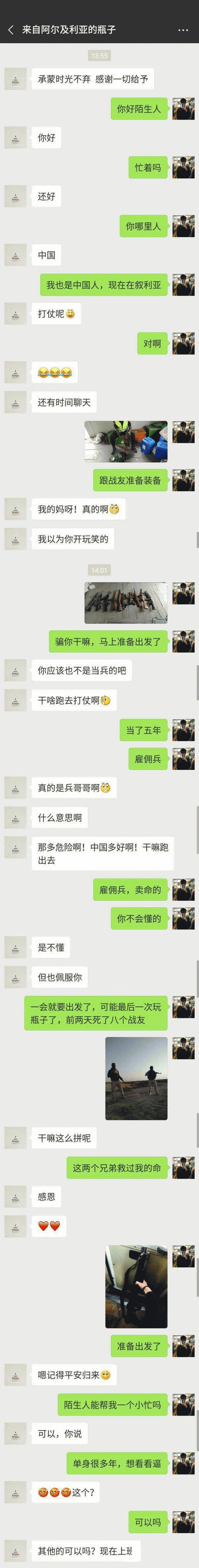 这是一个微信漂流瓶的聊天套路梗。一个自称是“雇佣兵”的人,通过漂流瓶到处骗女孩的裸照!说自己因为某种原因,不得不辍学到国外当雇佣兵,马上就要上战场了,希望对方满足自己一个愿望,就是发私处的照片给自己。