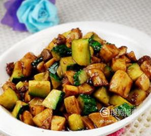 10)煸炒至每粒杏鲍菇和黄瓜丁都能够均匀沾满酱汁,加入鸡精调味即可。