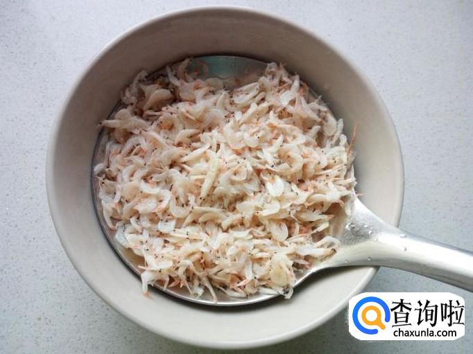 把虾皮放入水中浸泡几分钟使之变软,然后用水冲洗一下,控干水分,备用。
