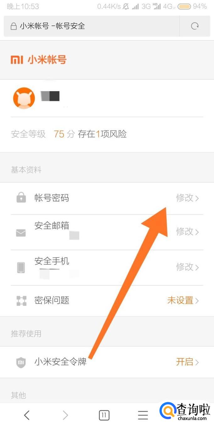 进入小米账号个人信息主页后,接着点击账号密码右边的修改字样。