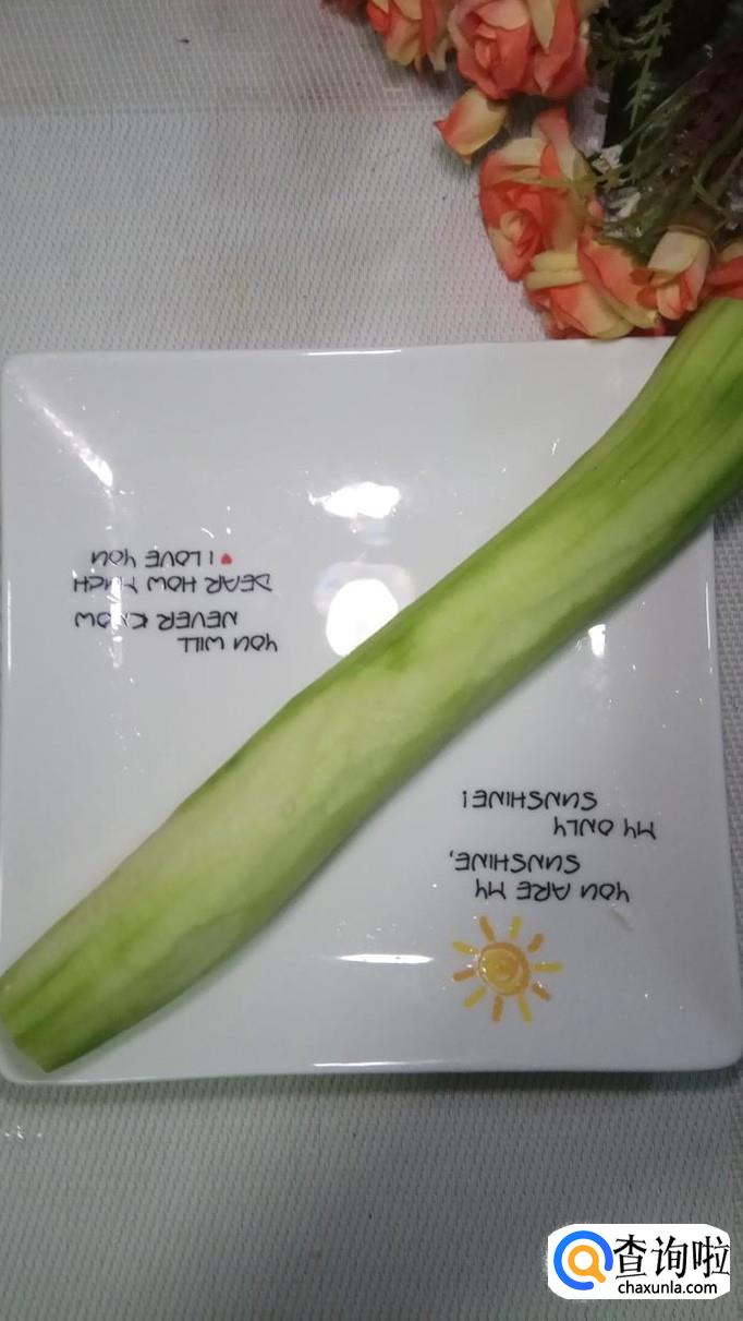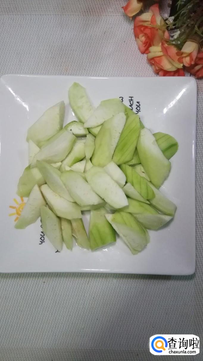 准备一根丝瓜和适量海鲜菇,将丝瓜洗净去皮后,切成滚刀块,放入盘中备用。