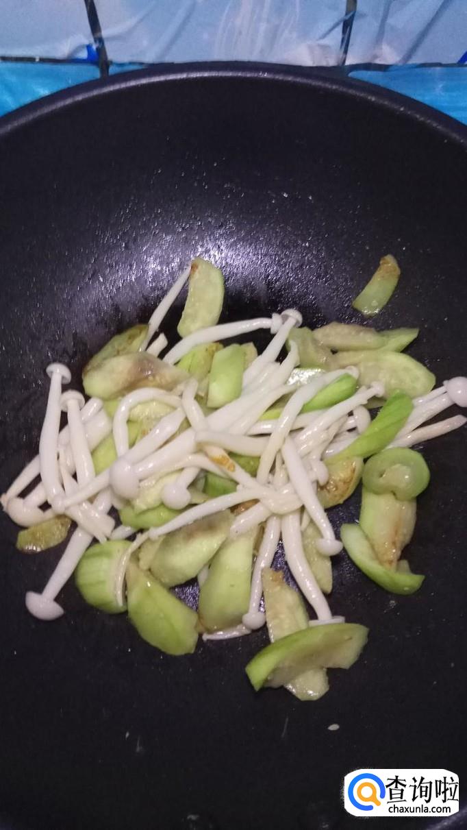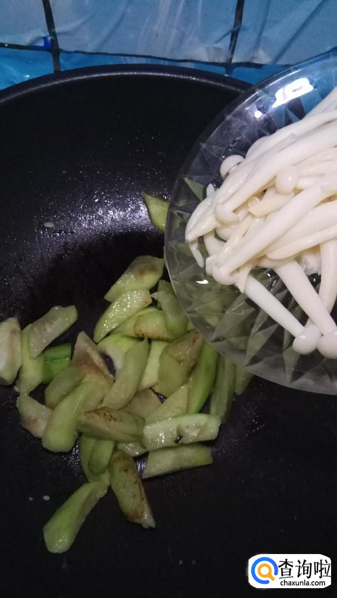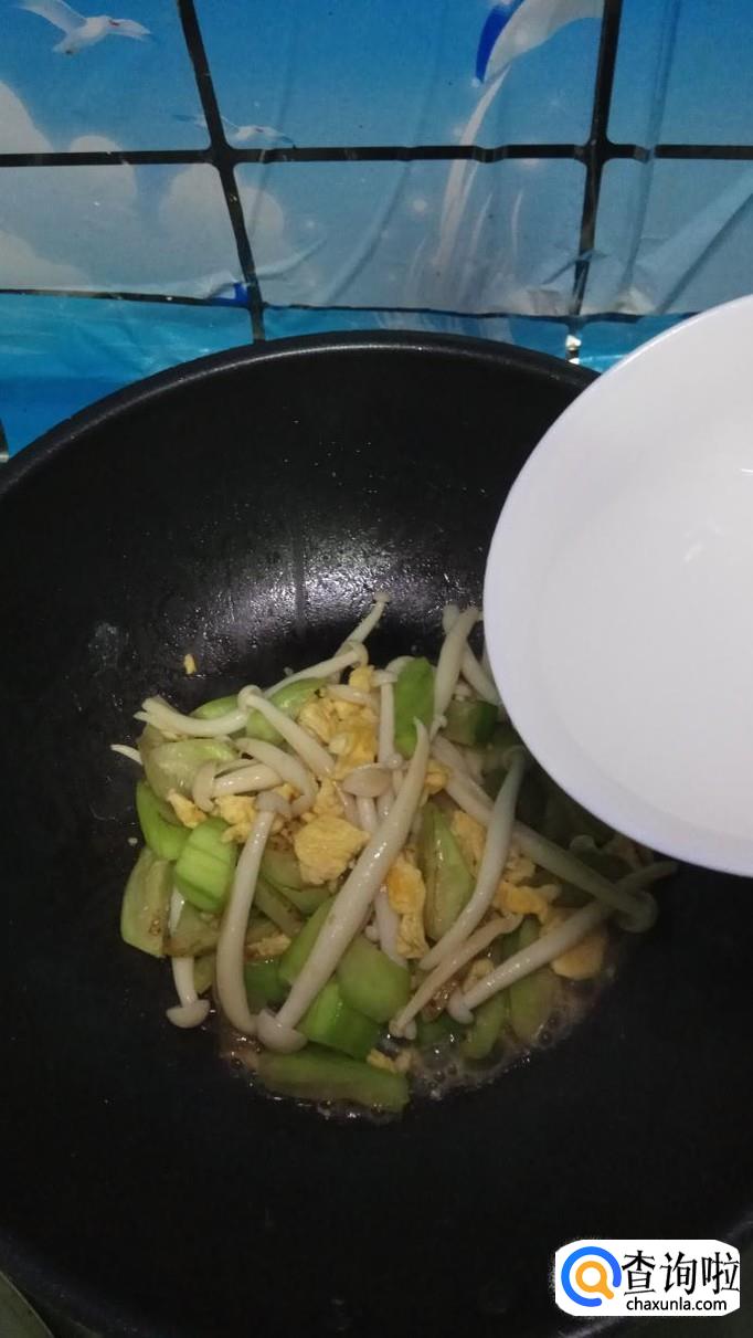 加入准备好的海鲜,和丝瓜一起翻炒,因为海鲜菇已经焯过水了,所以特别容易熟,不用炒太久。
