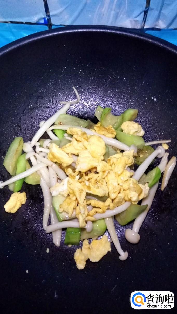 根据自己的口味加入适量盐,搅拌均匀,将之前炒好的鸡蛋,放入锅中。和丝瓜,海鲜菇一起搅拌。
