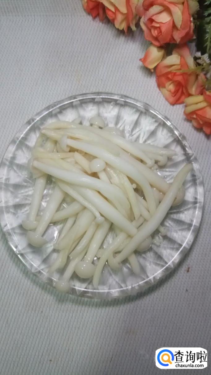 锅中烧开水,水开后将海鲜菇放入锅中焯水,盛出过凉水,控干水分,放入盘中备用。