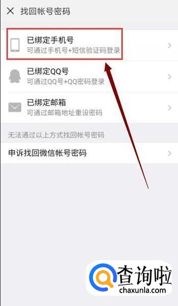 如果你的微信绑定了手机号,那么就点击“已绑定手机号”,绑定QQ号或者邮箱号也是同样的操作。