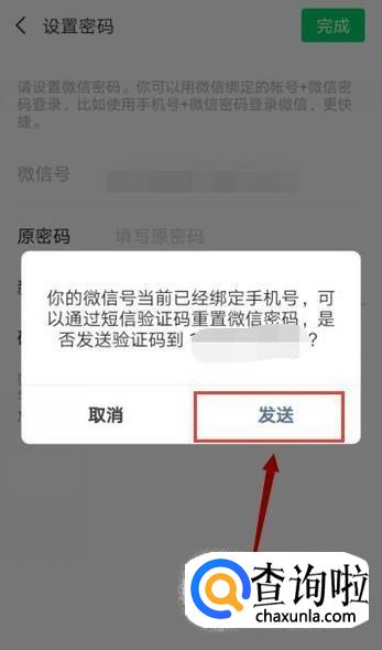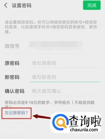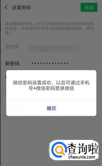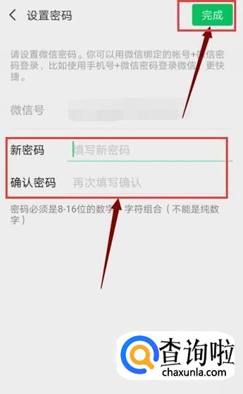 这时候,会回到“设置密码”界面,我们填写新密码,点击完成,以后就可以用“手机号+新密码”登陆微信了。