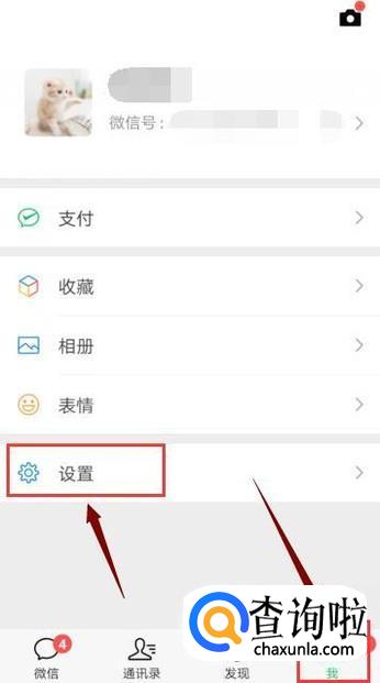 登陆微信后,点击菜单栏中的“我”,然后点击“设置”,如图所示。