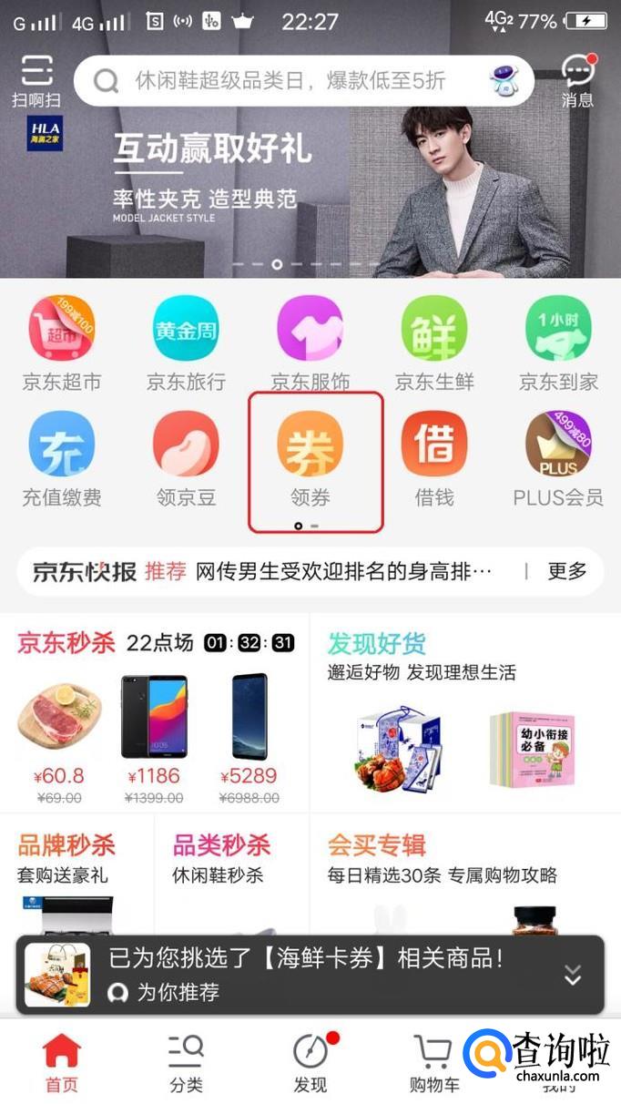 下载完成之后,打开app,如图所示,在首页上就可以看到“领券”图标了,我们点击一下(当然,领取之前会需要用账号先登录一下)。