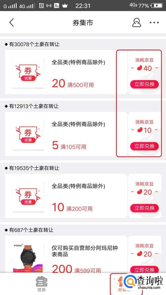 在“领券中心”的右下角,有一个“券集市”按钮,点击进去,我们也可以用京豆(京东发行的一种虚拟货币,在商城购物可以抵扣货款)兑换优惠券,京豆是在京东购物时赠送的,每天也可以签到领京豆。