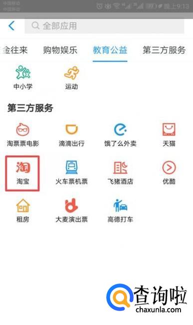 弹出的界面,我们下滑界面到最下方,然后我们在第三方服务中就可以看到淘宝了,我们点击淘宝;
