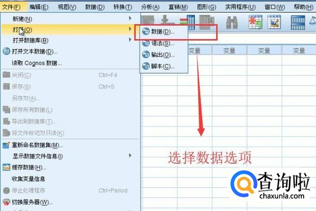 首先我们点击SPSS软件左上角的文件菜单,在下拉菜单中选择数据选项,如下图所示