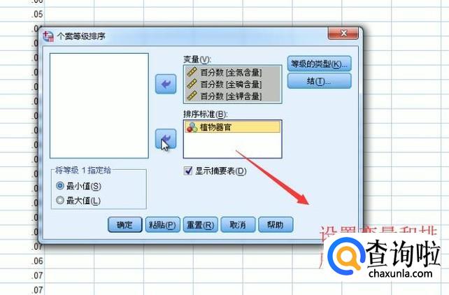 然后弹出的个案等级排序界面中我们设置变量和排序标准,如下图所示