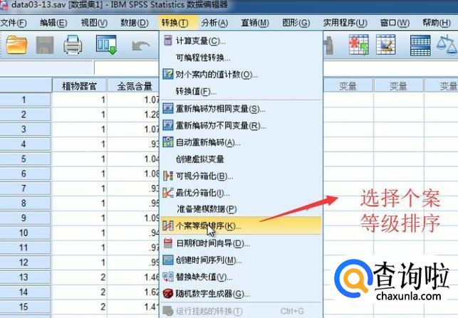 接下来点击顶部的转换菜单,接着选择下拉菜单中的个案等级排序选项,如下图所示