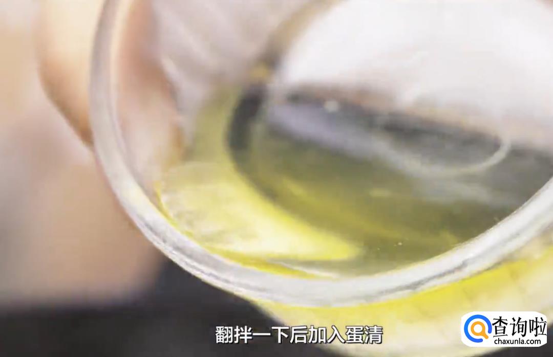 翻拌一下后加入蛋清,注意要用筷子划圈搅拌,让蛋清散成丝。