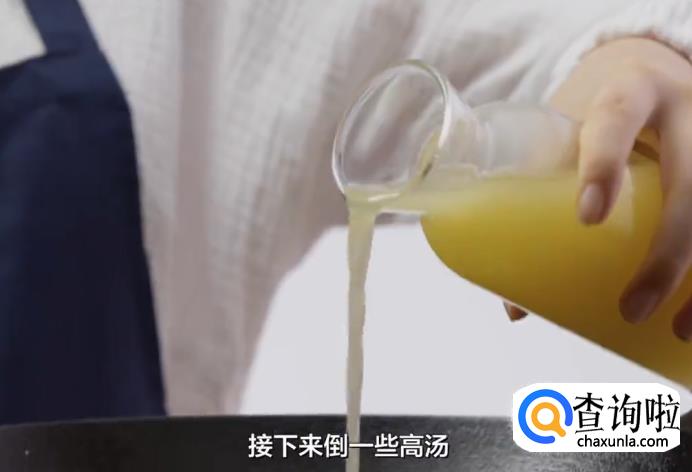 接下来,倒一些高汤,加一些水,淹没食材就可以了。