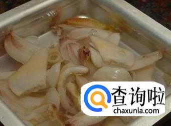 把用开水烫过的象拔蚌,放入冰的清水中浸泡几分钟,然后捞出备用。
