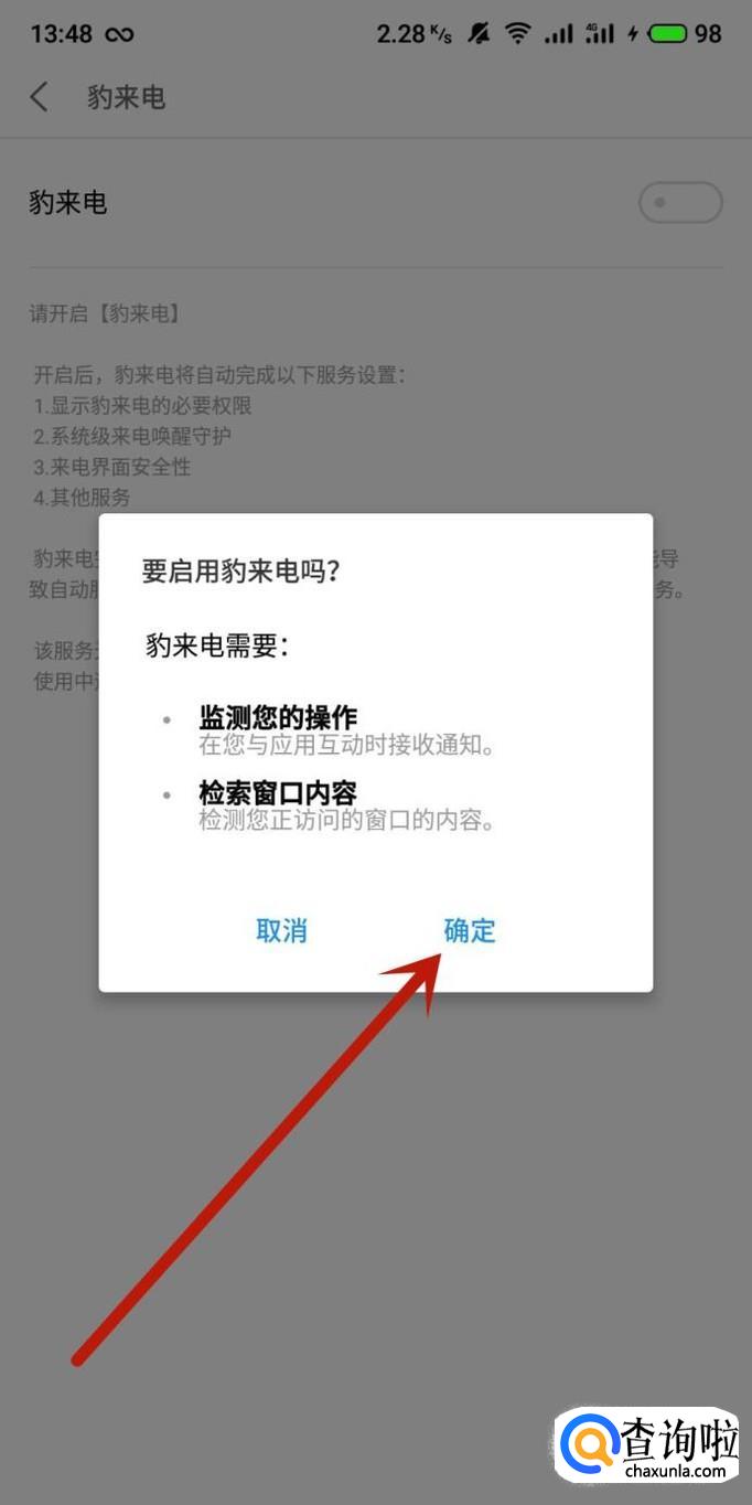 进入之后,将图示位置的开关打开,点击开关按键之后,在出现的弹框内选择“确定”,如图所示。