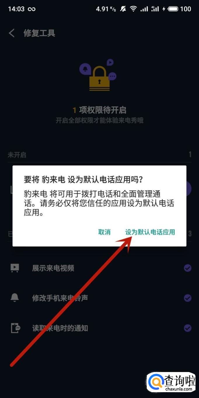 点击之后,在出现的弹筐内选择“设为默认电话应用”即可完成设置。
