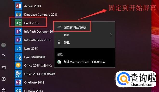 首先在所有程序中找到Excel2013的快捷方式,然后点击固定到开始屏幕