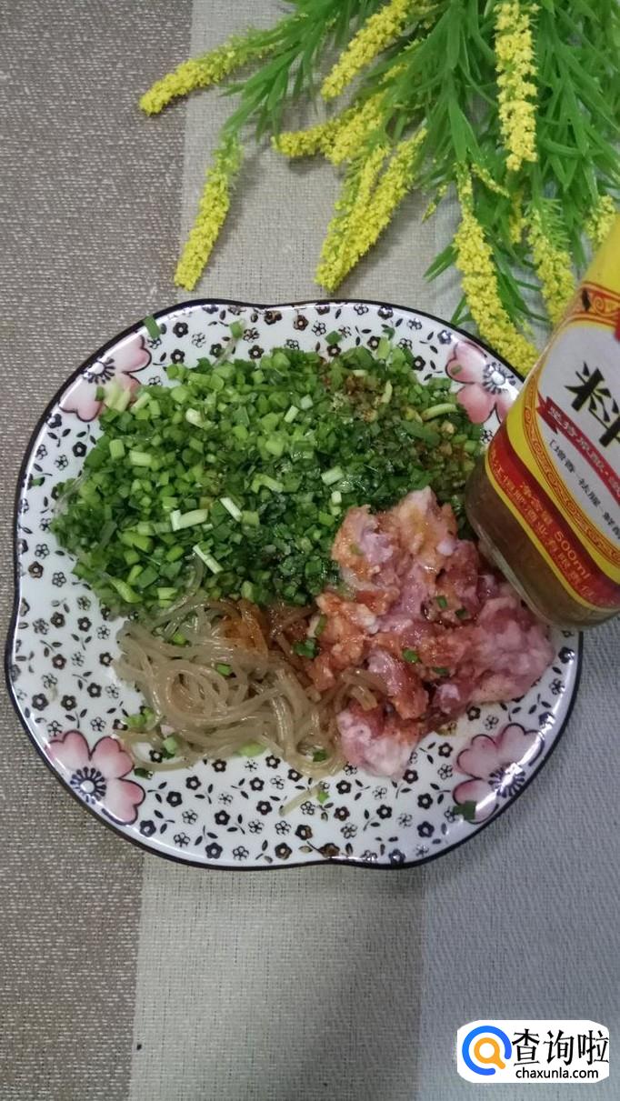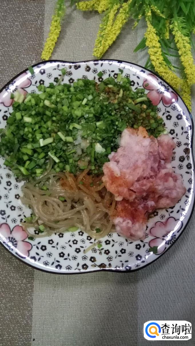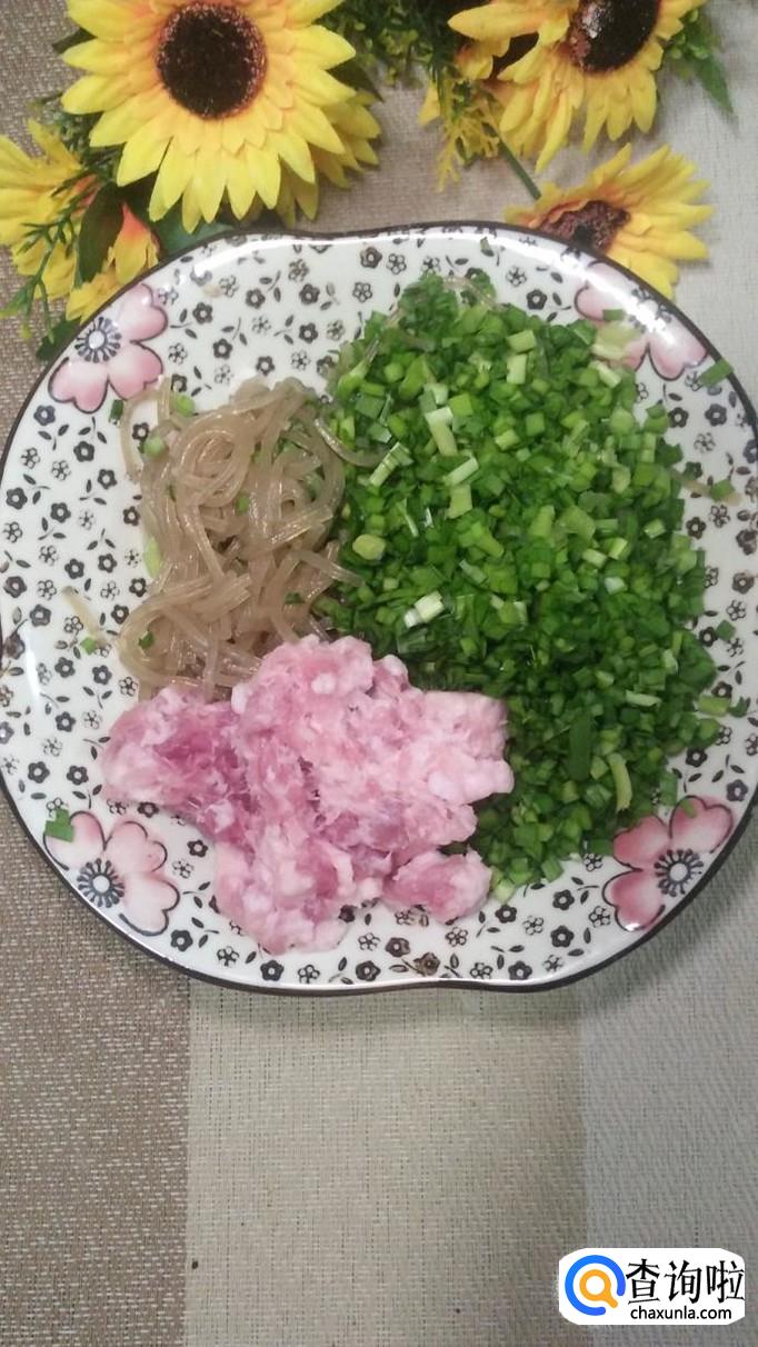 将韭菜和粉条豆切碎,再准备适量五花肉,切碎,和韭菜粉条放在一起。