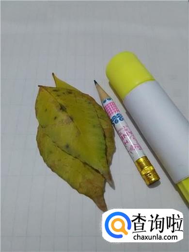 准备一张纸,两片树叶,一支笔,一个胶棒。