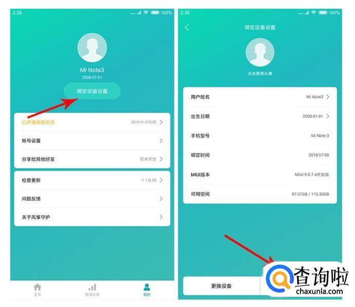 如果需要解绑设备,回到个人中心,点击上方的绑定设备设置,即可解除绑定。