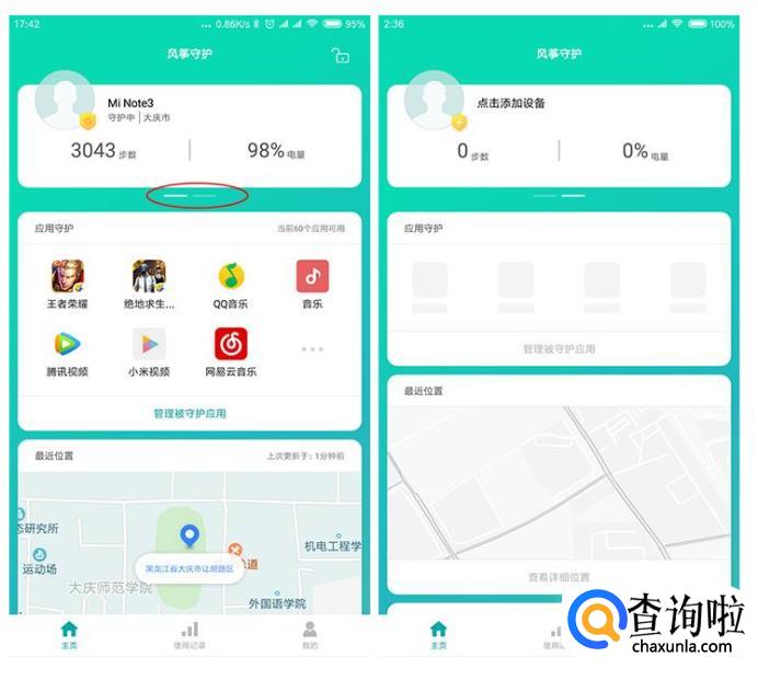 完成绑定之后,在首页最上方首先能看到被守护设备当前所处的城市,所走的步数以及设备的剩余电量,通过下方的状态条,可以看出,将这一栏右滑可以再次添加绑定新的设备,也就是说守护端可以同时守护多台设备,目前最多支持绑定三台,后期可能会继续增加。