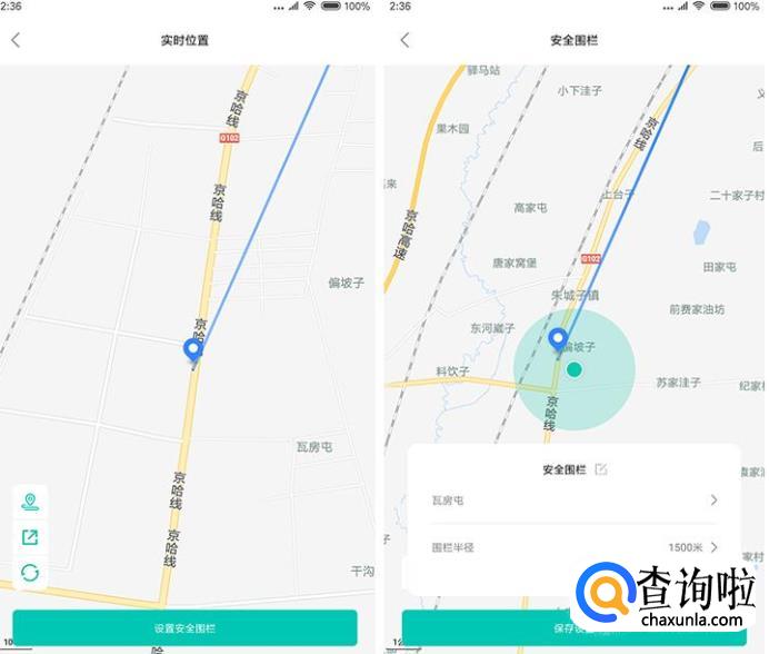 回到首页第三栏的最近位置功能,通过这项功能,可以看到被守护设备的当前位置,实时了解其位置信息和轨迹,类似于现在的儿童电话手表。点击下方的设置安全围栏,通过设置围栏地址和围栏半径,能够详细掌握设备的动态位置路线,目前位置移动轨迹信息的记录仅支持保留48小时。需要注意的是,设置围栏范围需要将手机的GPS设置为高精度模式,因此,对手机的电量消耗也会相对比较大。