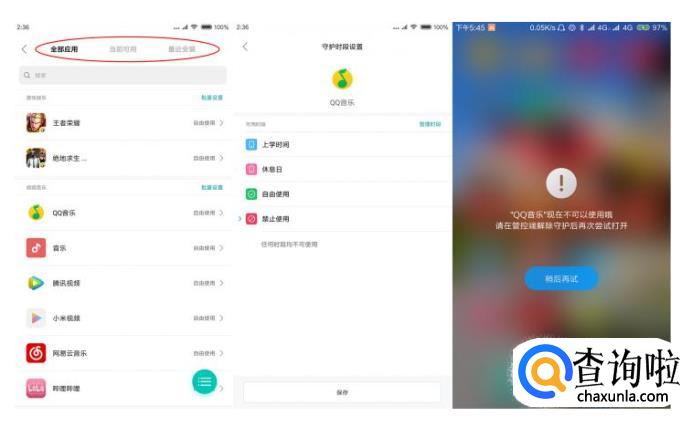 再看第二栏的应用守护,点击下方的管理被守护应用,通过上方可以分别查看设备的全部应用、当前可用以及最近安装。在全部应用下面又对应用进行了一个简单的分类,例如游戏娱乐,视频音乐以及生活工具。这样方便守护端可以一目了然的对APP进行管理。例如,当我们点开一项APP,首先可以直接对这项APP设置禁止使用或者自由使用,如果我们设置了禁止使用,在被守护端是无法打开该APP的。