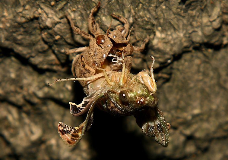 将要羽化时,于黄昏及夜间钻出土表,爬到树上,然后抓紧树皮,蜕皮羽化。当蝉蛹的背上出现一条黑色的裂缝时,蜕皮的过程就开始了,头先出来,紧接着露出绿色的身体和褶皱的翅膀,停留片刻,使翅膀变硬,颜色变深,便开始起飞。整个过程需要一个小时左右。