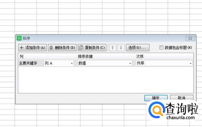 在出来的选项框中,我们选择列A、数值和升序,然后点击确定,此时,表格中的数就自动排列成升序了,如果想排成降序,方法相同。