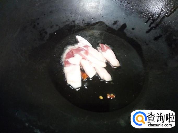 炒至肉下油,放入葱,姜翻炒,放入少许料酒,然后放入适量的水。