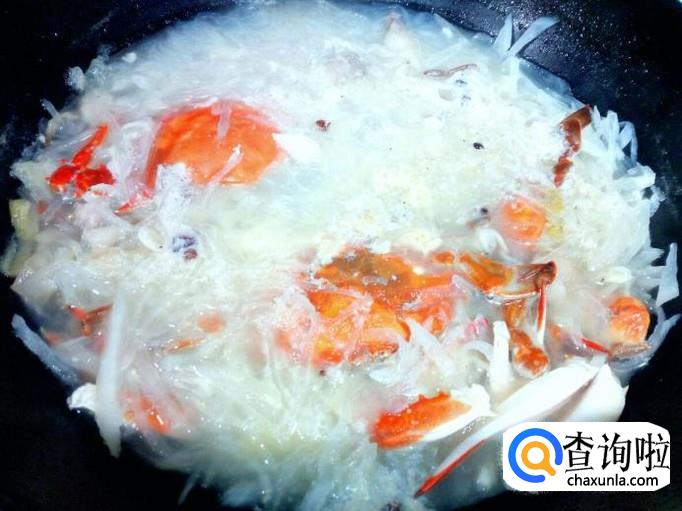 把萝卜丝,粉丝,虾皮,螃蟹一起放入水中,放入盐,大火烧开转中火煮。煮至五分钟的时间,放入味精,关火出勺。