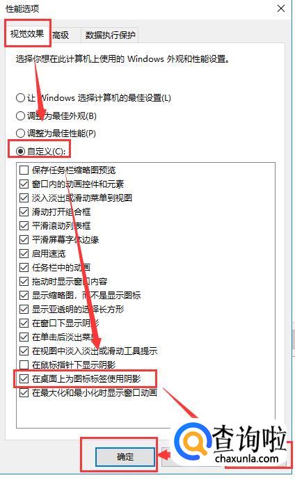 选择视觉效果,勾选自定义,然后勾选在桌面上为图标标签使用阴影,然后应用并确定即可。