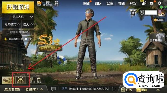 首先,登陆绝地求生刺激战场,进入游戏大厅后,点击屏幕左下角的“军备库”选项。
