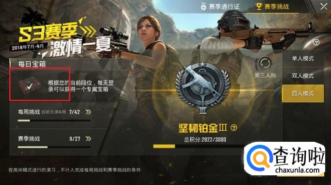 那么“赛季每日宝箱”又在哪里呢?返回游戏大厅界面,点击角色左侧的赛季标识牌进入赛季详情界面即可看到每日宝箱。