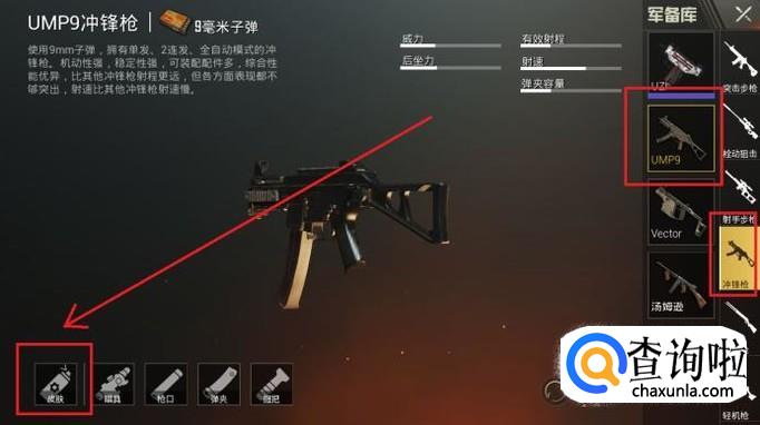 进入军备库界面后,在右侧选择冲锋枪中的UMP9,点击左下角枪械配件中的“皮肤”选项。