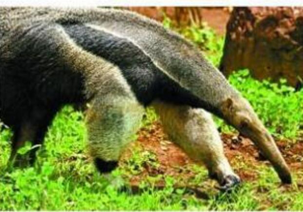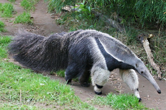 大食蚁兽属于贫齿目食蚁兽科,是食蚁兽的一种,分布在美洲部份地区,生活在草地、落叶林和雨林地区。大食蚁兽在现存四种食蚁兽中体型最大,体长可达1.8-2.4米。体重通常为29-65公斤。体毛长而坚硬,可长40厘米,尾部密生长毛,头细长,眼耳极小并吻成管状,无齿,舌细长并能伸缩,借以舐食蚁类、白蚁及其他昆虫一天最多可食30,000只。前肢除第五指外,均具钩爪,后肢短,五爪大小相仿。体灰白色,背面两侧有宽阔的黑色纵纹,纹的边缘白色。
